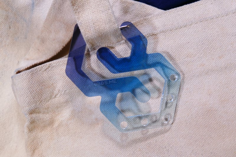 - These are single-sided carabiners with a cool shape, printed on clear acrylic. The metal gate at the top opens so you can hook it onto a bag strap or similar!